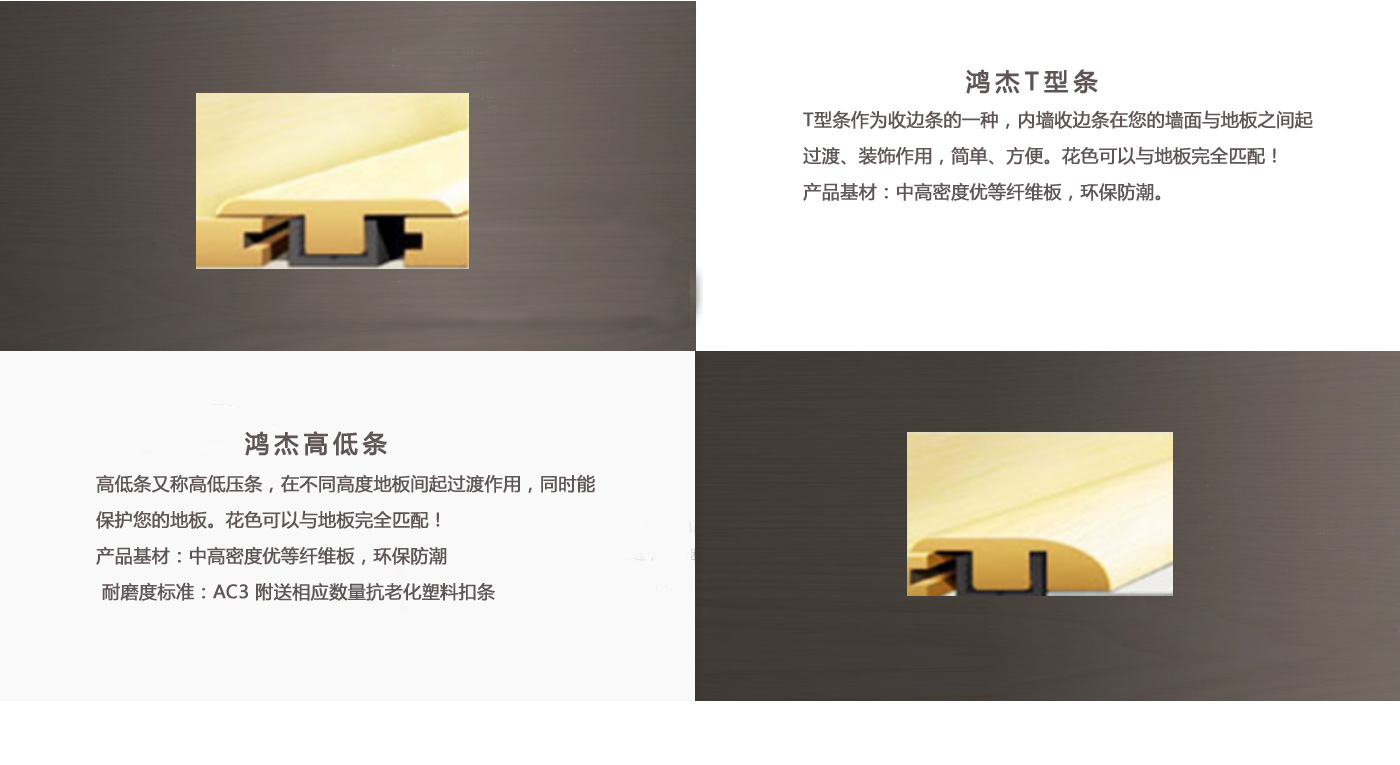 專業生產各類地板輔料。本廠成立于2008年,經過嚴格的質量控制,已開發出SPC、WPC、層壓板三種不同的壓花材料。每一種材料都有超過7種不同的過渡型材,如t型線、減速器、端蓋、四分之一圓、樓梯前鼻、樓梯板、踢腳板等。    SPC和WPC是我們的新產品,在世界各地越來越受歡迎。各種造型將達到您的個性化需求,100%匹配您的SPC, WPC或乙烯基地板的顏色。     我們的傳統產品——層壓板是世界領先的產品之一,具有熱壓耐磨層加工技術,高溫高壓。其質量可靠,品種齊全,經久耐用,耐磨,使層壓板成型經久不衰。     我公司不僅與國內一些大型、信譽良好的地板生產廠家和代理商建立了長期的合作關系,產品還出口到臺灣、日本、菲律賓、美國、加拿大、非洲、澳大利亞、歐洲等國家和地區。 歡迎來廠參觀、洽談業務。